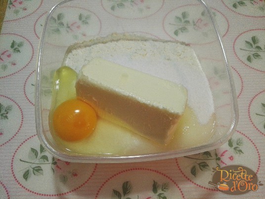Prepariamo adesso la pasta frolla. Impastiamo la farina, il lievito pan degli angeli, il burro e l’uovo