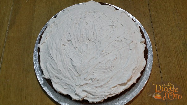 Aggiungete sulla torta l’altra metà della farcia e livellate bene, coprite bene anche i bordi